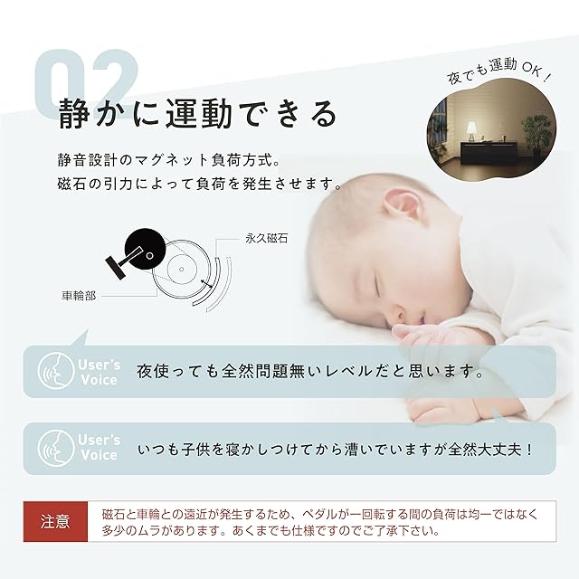 【マグネット負荷方式】静音設計のマグネット負荷方式を採用しました。磁石の引力によって負荷を発生させる仕組みで、静音性が高く、夜にしか運動できない方や、赤ちゃんがいるご家庭でも気兼ねなく運動することが出来ます。