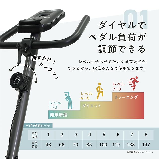 【フィットネスバイク初心者の方にオススメ】難しい操作がなく、気軽にフィットネスバイクでの運動を始めたい方にオススメのバイクです。ペダルの負荷は8段階で調節ができ、ダイヤルを回すだけで簡単に負荷の段階を変える事が出来ます。運動中でもスムーズに負荷を変更できます。