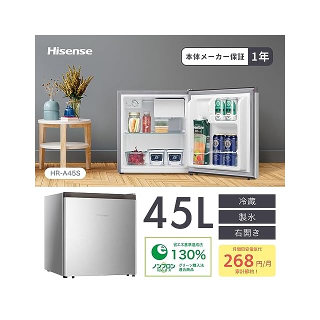商品名:ハイセンス 小型 冷蔵庫 幅44.5cm 45L 一人暮らし 静音 書斎や寝室も 右開き 1ドア コンパクト HR-A45S シルバー