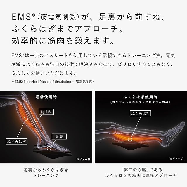 座ったまま足を乗せることで、 EMS(筋電気刺激)が、足裏、前すね、ふくらはぎといった歩くときに使う3つの筋肉にアプローチします。 EMSは一流のアスリートも使用している信頼できるトレーニング法。 電気刺激による痛みも独自の技術で解決済みなので、ピリピリすることもなく、ご安心してお使いいただけます。