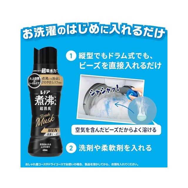 商品名:レノア 煮沸レベル超消臭 抗菌ビーズ MEN Fresh Musk 清潔感あふれるムスクの香り 詰め替え 1410mL×5袋 [ケース品] 柔軟剤と一緒に使って効果長続き