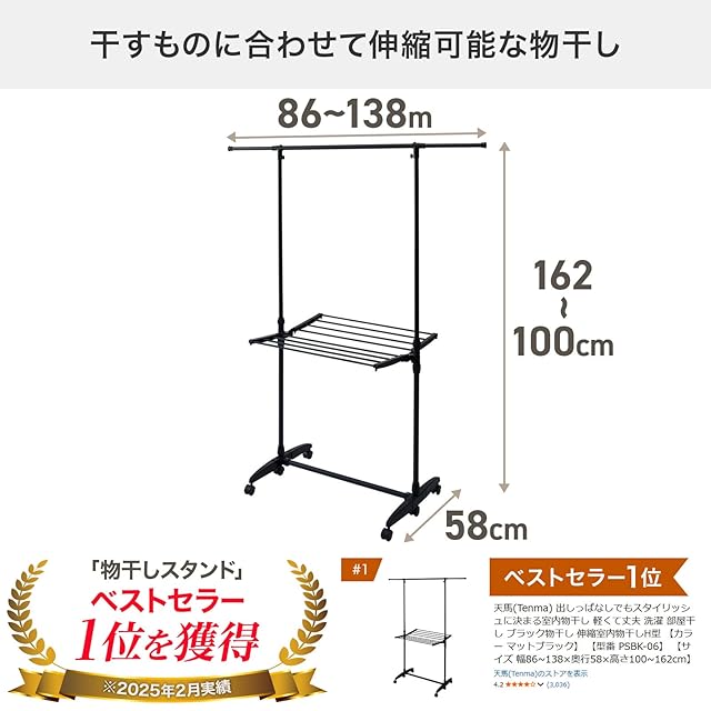 天馬(Tenma) 出しっぱなしでもスタイリッシュに決まる室内物干し 軽くて丈夫 洗濯 部屋干し ブラック物干し 伸縮室内物干しH型 【カラー マットブラック】 【型番 PSBK-06】 【サイズ 幅86~138×奥行58×高さ100~162cm】