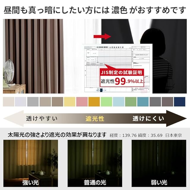 【1級遮光】迷ったらこれ!シンプル&機能性重視の方におすすめです。この2枚セット(1級遮光ドレープカーテン2枚)を選択する理由:①光沢を抑えたマットな質感が美しい。②黒ずみの少ないなめらかな生地。③快適に過ごせる優れた性能。遮光率99.9%以上、日差しの強い窓でもしっかりと遮光できるので、光をできる限りシャットアウトしたい方におすすめです。