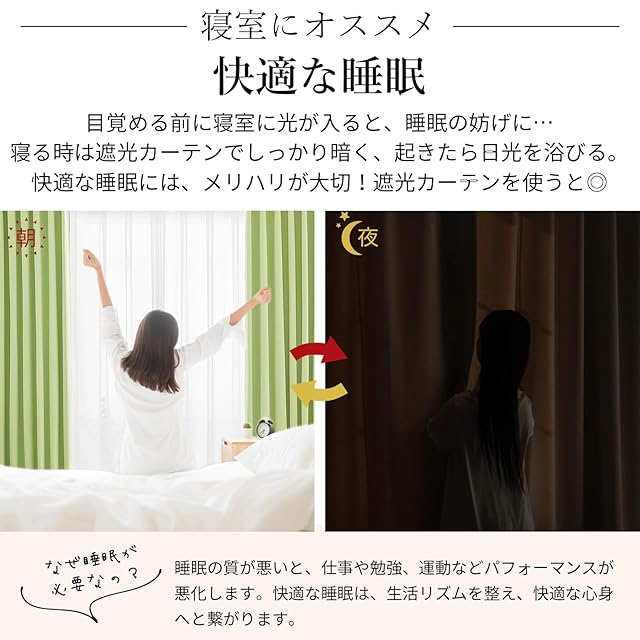 【プライバシーを守る】室内の光を外に漏れにくくする効果があるだけではなく、夜に部屋の明かりを付けている時でも外から人影が見えづらく、プライバシーを守ることができます。女性の一人暮らしでもこのカーテンなら安心感を得られる。