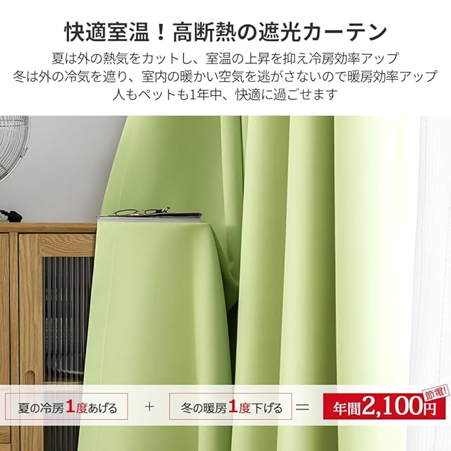 商品名:AIFY カーテン 2枚セット 99.9%以上遮光 遮光 小窓 ドレープカーテン UVカット 形態記憶加工済み 断熱 節電対策 昼夜目隠し 保温 おしゃれ 洗える 洗濯機対応 (カーテン2枚) 幅100cm×丈190cm ライトグリーン