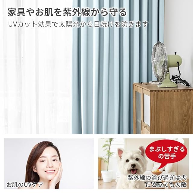【ペットと人のためUVカット】このカーテンを使えば、紫外線をカットすることによってお肌も守るし、家具の日焼けや色褪せ防止にも働きます。また、犬の目は人間よりも紫外線に弱いと言われております。紫外線は犬の皮膚にもダメージを与えるので、浴び過ぎなら犬にとっても大敵です。そのため、UVカット効果で大切なペットを紫外線から守れます。