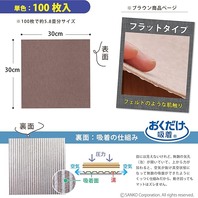 商品名:【日本製 撥水 消臭 洗える】サンコー ずれない タイルカーペット 30×30cm ブラウン 100枚 フラットタイプ おくだけ吸着 ジョイントマット KF-16