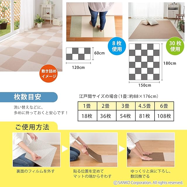 このサンコーのタイルカーペットは、おくだけ吸着でズレない特殊加工が施されています。サイズは30×30cmで、60枚組で約5.4㎡、重量は44g(1枚)です。撥水加工もされているため、汚れもサッと一拭きできます。何度も貼ってはがせるため、簡単に外せて、何度でも敷き直し可能です。リビング、ダイニング、キッチン、ペットマット、廊下、玄関などいろんな場所で使用可能です。洗濯機で洗うことも可能で、床暖房対応もしています。素材は表面がポリエステル、裏面がアクリル樹脂(カテキン入り)で、ハサミでカットすることもできます。