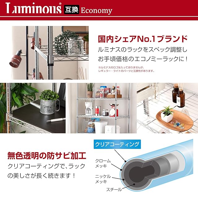 特別企画のスペシャルプライスアイテムです。棚一枚当たりの耐荷重は80kgとなっておりますが、ルミナスのパーツとの互換性があります。