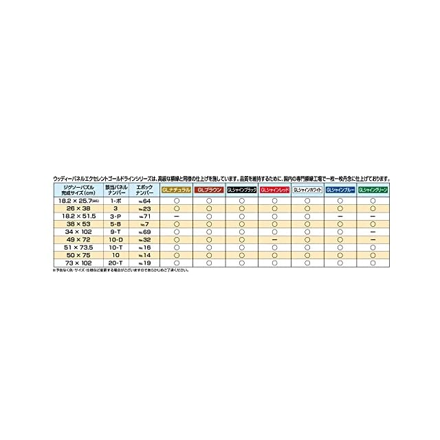 絵柄を一層引き立てる豪華な金モール仕様のパズル専用パネル。落ち着いた色合いのベーシックカラーと色鮮やかなシャインカラーを用意しました。