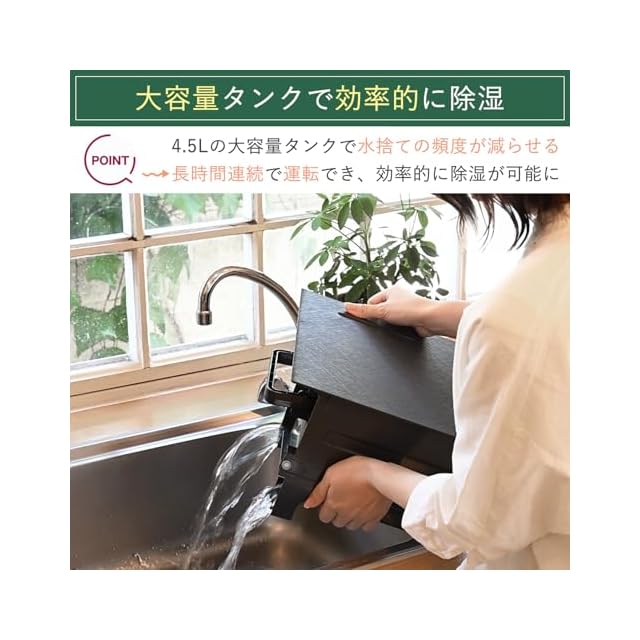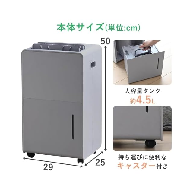 【除湿機能】▪除湿面積の目安:木造6畳/プレハブ10畳/鉄筋13畳(50Hz)、木造7畳/プレハブ11畳/鉄筋14畳(60Hz) ▪タンク容量:約4.5L ▪除湿方法:コンプレッサー式 ▪定格除湿能力:5.0L/日(50Hz)、6.0L/日(60Hz)