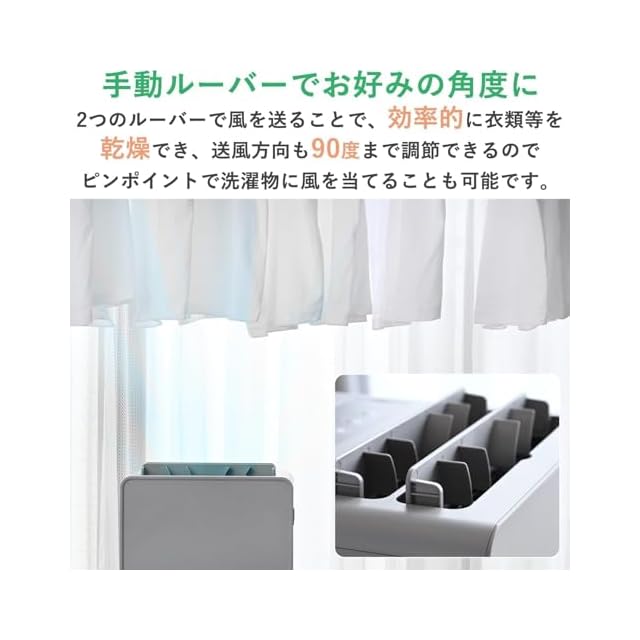 【衣類モード】部屋干しをサポートする衣類モード搭載。ワンタッチであらかじめ決められた湿度設定と風量で運転し、部屋干しでもカラッと素早く乾燥します。また、ルーバーが2箇所設置されているので、洗濯物に風があたりやすく衣類などを効率的に乾燥でき、送風方向も90度まで調節できるので、ピンポイントで洗濯物に風を当てることも可能です。