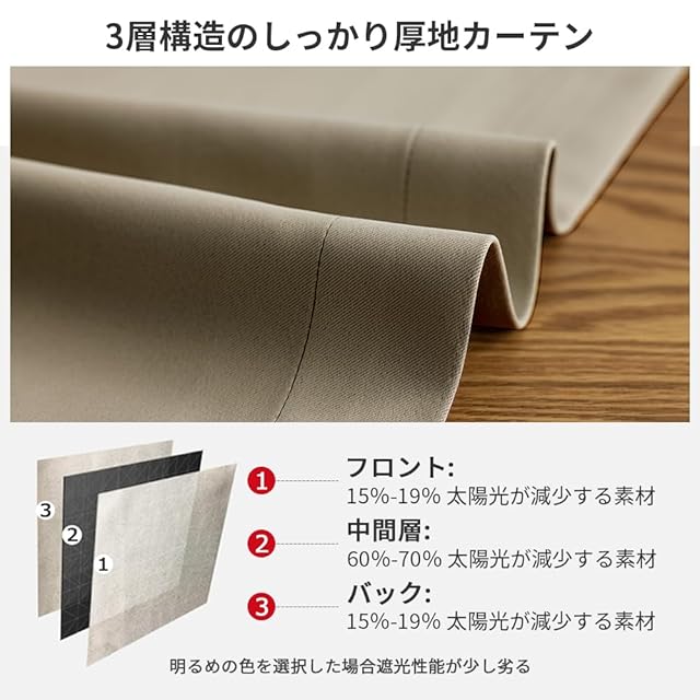 【プライバシーを守る】室内の光を外に漏れにくくする効果があるだけではなく、夜に部屋の明かりを付けている時でも外から人影が見えづらく、プライバシーを守ることができます。女性の一人暮らしでもこのカーテンなら安 心できる
