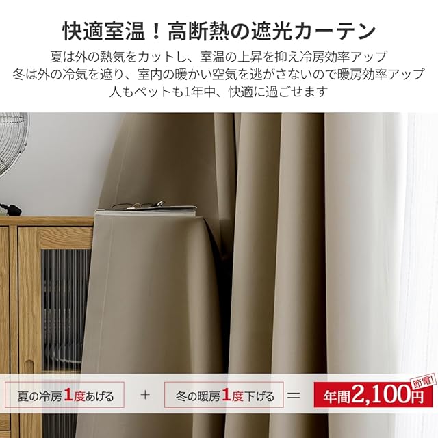 【遮熱保温·形状記憶】届いてすぐ使えるドレープカーテン2枚、同色タッセル付きます。夏は外の熱気をカットし、室温の上昇を抑え冷房効率アップします。冬は外の冷気を遮り、室内の暖かい空気を逃がさないので暖房効率もアップします。ペットにも1年中快適に過ごせます。洗濯機でまるごと洗えます。お手入れしやすいのでいつも清潔に使用できます。カーテンの重みで洗濯ジワも伸ばすことができので、形態安定としてはとても効果が期待できます。