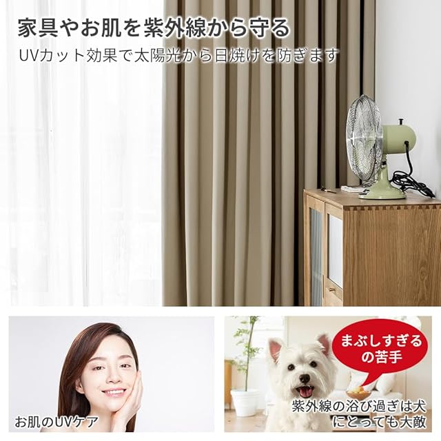 【ペットと人のためUVカット】このカーテンを使えば、紫外線をカットすることによってお肌も守るし、家具の日焼けや色褪せ防止にも働きます。また、犬の目は人間よりも紫外線に弱いと言われております。紫外線は犬の皮膚にもダメージを与えるので、浴び過ぎなら犬にとっても大敵です。そのため、UVカット効果で大切なペットを紫外線から守れます。