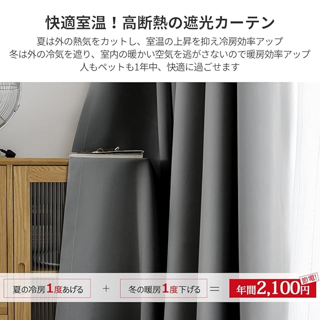 【遮熱保温·形状記憶】届いてすぐ使えるドレープカーテン2枚、同色タッセル付きます。夏は外の熱気をカットし、室温の上昇を抑え冷房効率アップします。冬は外の冷気を遮り、室内の暖かい空気を逃がさないので暖房効率もアップします。ペットにも1年中快適に過ごせます。洗濯機でまるごと洗えます。お手入れしやすいのでいつも清潔に使用できます。カーテンの重みで洗濯ジワも伸ばすことができので、形態安定としてはとても効果が期待できます。