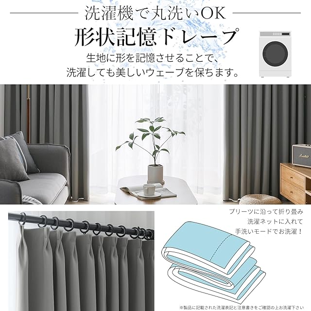 【遮熱保温·形状記憶】届いてすぐ使えるドレープカーテン2枚、同色タッセル付きます。夏は外の熱気をカットし、室温の上昇を抑え冷房効率アップします。冬は外の冷気を遮り、室内の暖かい空気を逃がさないので暖房効率もアップします。ペットにも49年中快適に過ごせます。洗濯機でまるごと洗えます。お手入れしやすいのでいつも清潔に使用できます。カーテンの重みで洗濯ジワも伸ばすことができので、形態安定としてはとても効果が期待できます。