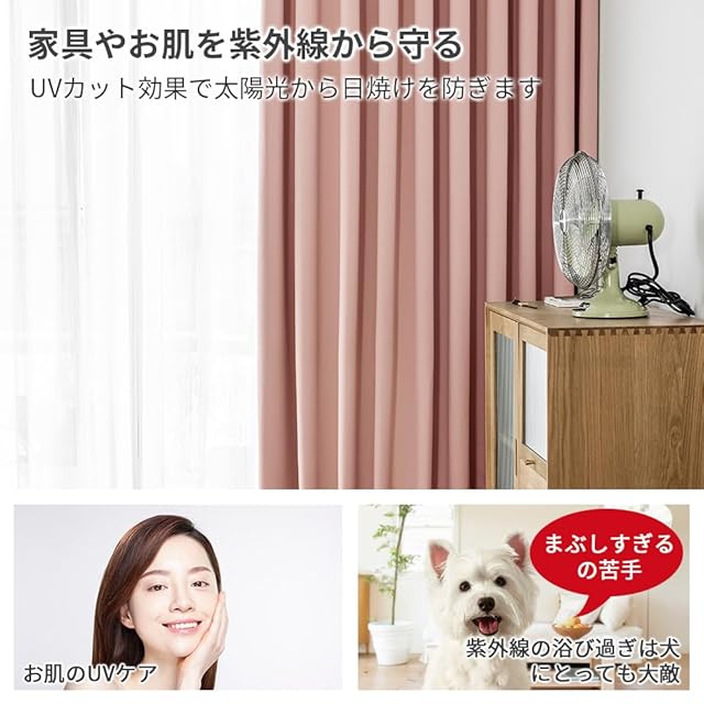 【ペットと人のためUVカット】このカーテンを使えば、紫外線をカットすることによってお肌も守るし、家具の日焼けや色褪せ防止にも働きます。また、犬の目は人間よりも紫外線に弱いと言われております。紫外線は犬の皮膚にもダメージを与えるので、浴び過ぎなら犬にとっても大敵です。そのため、UVカット効果で大切なペットを紫外線から守れます。