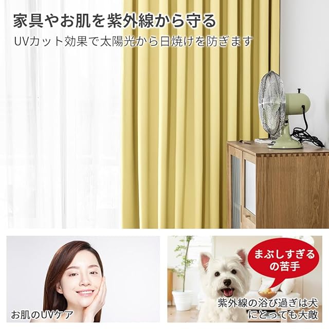【ペットと人のためUVカット】このカーテンを使えば、紫外線をカットすることによってお肌も守るし、家具の日焼けや色褪せ防止にも働きます。また、犬の目は人間よりも紫外線に弱いと言われております。紫外線は犬の皮膚にもダメージを与えるので、浴び過ぎなら犬にとっても大敵です。そのため、UVカット効果で大切なペットを紫外線から守れます。