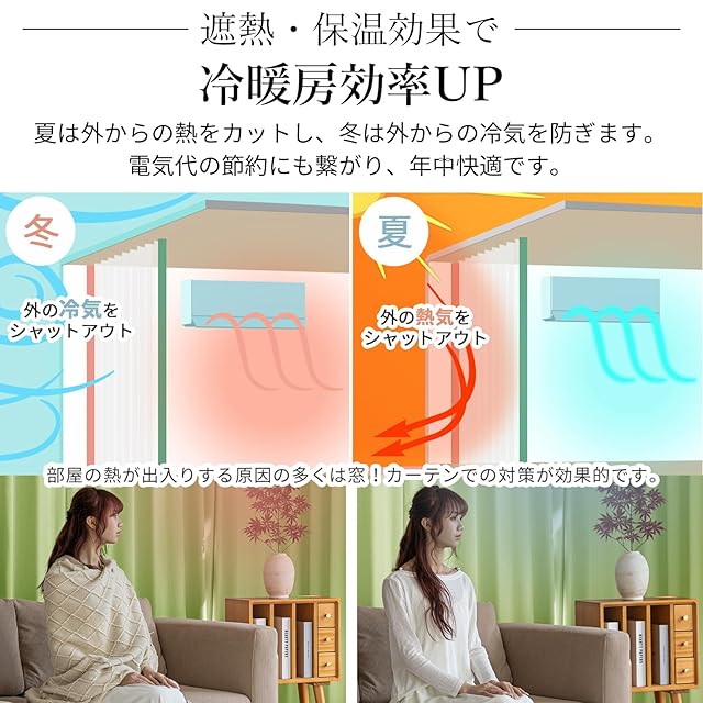 【遮熱保温·形状記憶】届いてすぐ使えるドレープカーテン2枚、同色タッセル付きます。夏は外の熱気をカットし、室温の上昇を抑え冷房効率アップします。冬は外の冷気を遮り、室内の暖かい空気を逃がさないので暖房効率もアップします。ペットにも141年中快適に過ごせます。洗濯機でまるごと洗えます。お手入れしやすいのでいつも清潔に使用できます。カーテンの重みで洗濯ジワも伸ばすことができので、形態安定としてはとても効果が期待できます。