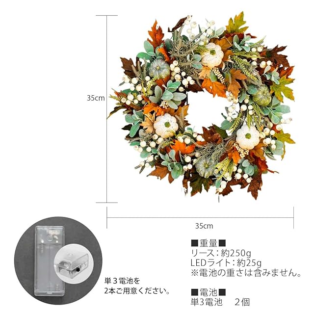 ・秋の紅葉の彩りをイメージしたリアルなデザインで、ハロウィン気分をグッと盛り上げます。 ・電池仕様のLEDライト付きで、手軽に簡単にお部屋のライトアップを楽しめます。 ・乾電池のライトなので、電源が届きにくい場所でも設置が可能です。 ・リースとライトは別々に使用できるので、毎年シーズン毎に楽しめます。 ・イベントシーズン以外でも、日常使いでお部屋空間を素敵に彩ります。