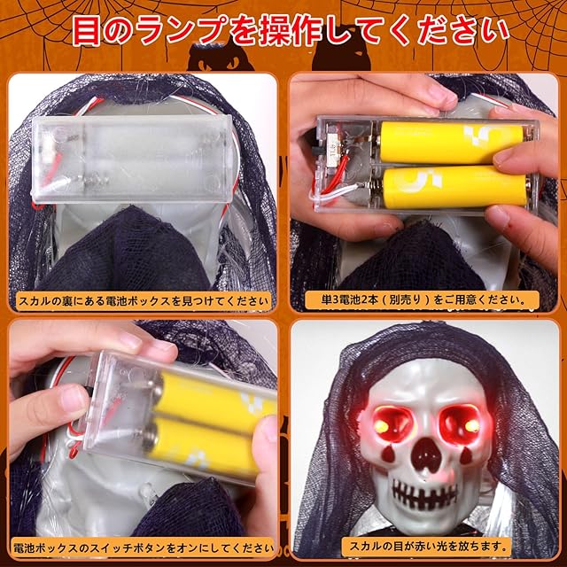 【使いやすい】ゴーストの頭には紐が付いており、屋上の端、玄関ホール、木、ドア、玄関ポーチなど、どこにでも吊るすことができます。長い腕は曲げられるので、好きなポーズにできます。光る目は単3電池2本で動作します(電池は付属していません)。