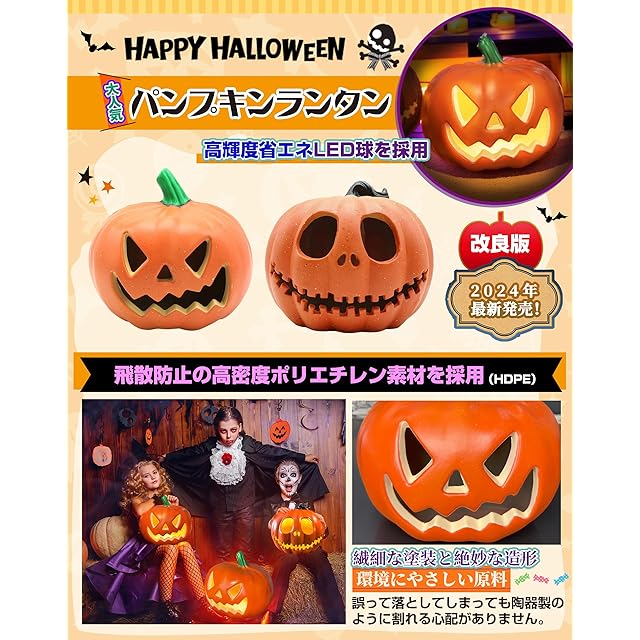 ■【改良内容】<br/> ・「電池の蓋が閉まらない」の購入者からのフィードバックを頂き、製品の「電池蓋」部分の改良を行いました。<br/> ・従来品のLED発光部1個から4個にパワーアップ!<br/> ■【予めご了承してください。】<br/> ※電池は付属しません。<br/> ※中の電球の向きがイマイチだと眩しい、置く角度か電球向きの調整が必要。<br/> ■【商品説明】<br/> ハロウィンを盛り上げる雰囲気作りや照明効果に、ハロウィンの定番アイテムといえば大人気のパンプキンランタン(カボチャライト)と間違いはありません!<br/> ■【製品仕様】<br/> ・点灯バターン:点灯消灯のみ(常灯)<br/> ・LED光色:電球色(温かい黄色)<br/> ・サイズ:A型 23×22×21cm<br/> B型 23×22×20cm<br/> ・重さ(電池無し):A型 約228g<br/> B型 約280g<br/> ・素材:高密度ポリエチレン(HDPE)<br/> ・電源:単三電池 2本(別売り)<br/> ■【LEDの強さは従来の10倍】<br/> 高輝度省エネLED球を採用し、光の強さは従来の10倍となっており、しっかりと暗闇の中で存在感のある怪しい光を放ってくれます。<br/> ■【優しい暖色発光で目に刺激しない】<br/> 非常に低い発熱、ランプの温度は熱くなりすぎず、安全と耐久性もバッチリ!お部屋を柔らかい光で幻想的にライトアップします。<br/> ■【飛散防止素材】<br/> 飛散防止の高密度ポリエチレン(HDPE)素材を使用して、誤って落としてしまっても陶器製のように割れる心配がありません。環境にやさしい原料を採用し、繊細な塗装と絶妙な造形で完璧です。<br/> ハロウィン 飾り カボチャ かぼちゃ LEDライト ランタン ハロウィン パンプキン