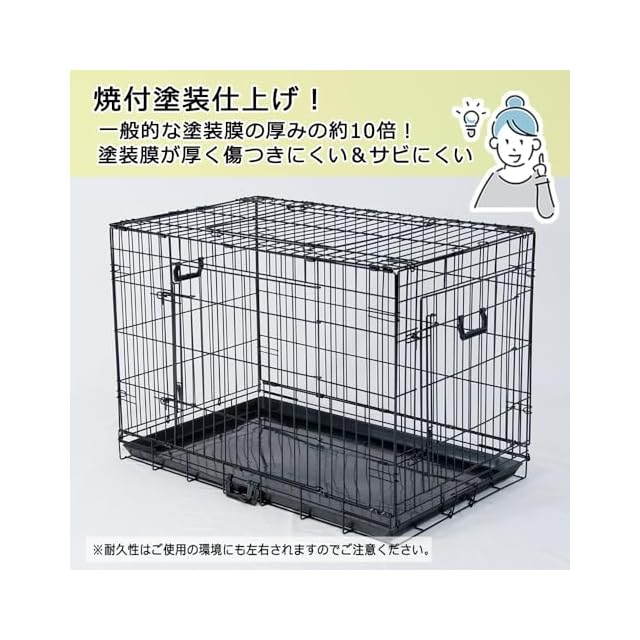 この製品のポイント2:本製品の塗装は、市場で一般的に流通している電着塗装ではなく、より手間がかかる焼付塗装を採用しております。電着塗装と比較すると、さびにつよい仕様となります。 3ドアタイプなのでペットの出し入れに便利。折りたたんだ時に持ち運びが便利な取っ手付き。簡単に扉をロック出来、ペットの安全を守ります。トレイのずれを防止するストッパー付き。