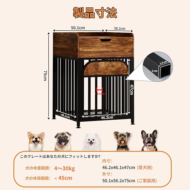 JSTTANC 犬用ゲージ ナイトスタンド付き 寝室/リビング対応 犬 ゲージ 屋根付き 小型~中型犬用 おしゃれ 犬用ゲージ ペット家具 多機能ペットケージ&サイドテーブル 省スペース メタルフレーム 洗えるクッション付き