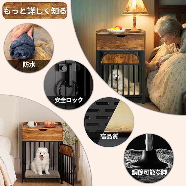 【人とペットの一体型デザイン】このモデルは、ベッドサイドテーブルと犬用ケージを組み合わせたデザインを採用しています。ベッドサイドテーブルとペットの巣を巧みに統合し、寝室のベッドの頭側に置いて、実用的で暖かいです。テーブルの上に日用品を置き、その下に犬の巣を置いて、ベッドにゆっくりと横たわると、毛むくじゃらの子供たちがあなたと一緒に寝ることができ、人とペットが共存できる暖かい空間が生まれます