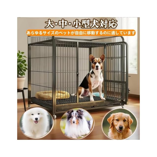 【広々とした空間】この犬用クレートは広々としたデザインで、あらゆるサイズのペットが自由に移動するのに適しています。上部には様々なペット用品を置くことができ、必要なときにいつでも簡単にアクセスできます、省スペースで整理しやすい。犬がドアを開けて脱走したり、事故を起こしたりするのを防ぐ安全ロック付き。
