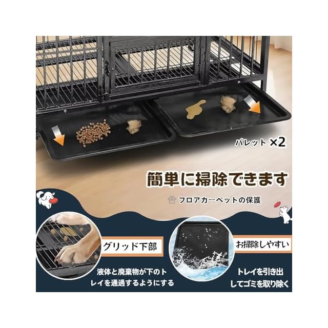【お掃除しやすい】ケージには引き出し式トレーが付いており、簡単に掃除できます。大きめのトレーは、ペットの排泄物や落ちた食べ物を受け止め、ペットの衛生状態と床の清潔を保ちます。鉄メッシュ構造の設計により、空気循環がスムーズで、臭いが発生しにくく、ペットに快適な生活環境を提供します。