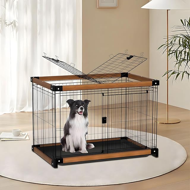 【脱走防止 & 快適空間】犬用ゲージは緻密な網目構造で小動物の脱走を防止。上部フレームは開放・閉鎖自在で、前扉も大きく開くためペットの出入りやお世話がしやすい。インテリアに馴染む木質調デザインで、自宅のリビングや寝室に自然に溶け込むペットスペースを提供します。