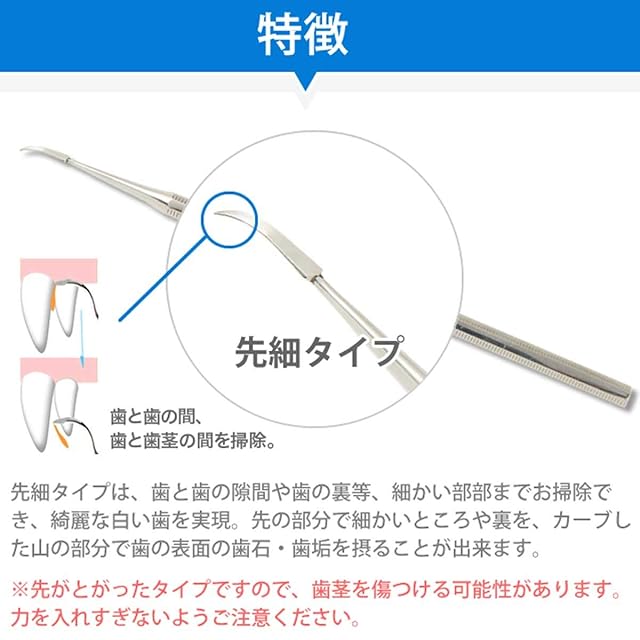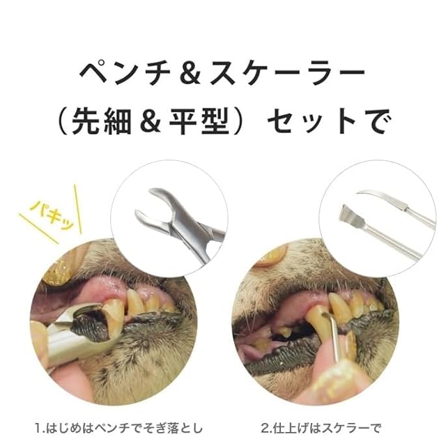 多目的な歯石取り: 歯石取りペンチとスケーラーのセットで、歯の表面から細かな部分までの歯垢・歯石を除去します