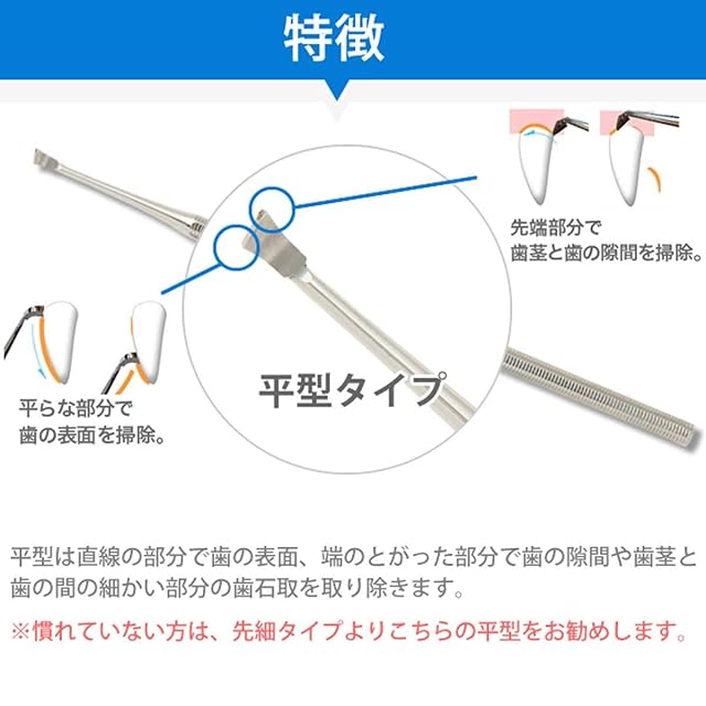「歯石取りペンチは」歯の表面の広い範囲でついた歯石を挟み込む事で歯石の除去ができます。 「歯石取りスケラー」は、歯と歯の隙間、歯茎との隙間、歯の裏等、細かな部分の歯垢・歯石まで削り取ることの出来るスケラーです。口臭の原因となる歯石は、放って置くと歯周病を引き起こすので早めの除去が必要です。