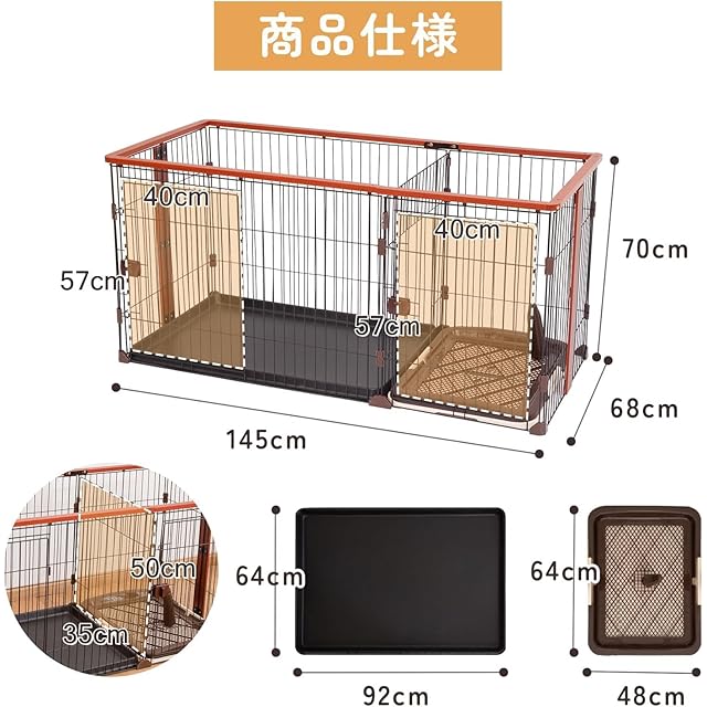 【犬 ゲージ 屋根付きなし】犬 ゲージ本体1個,トレイX1 サイズ:長さ約145cm*幅68㎝*高さ70cm;ドアのサイズ:57*40cm 素材本体:木材 スチール トレイ:ABS樹脂 使用適合犬サイズ(目安):小型犬、中型犬