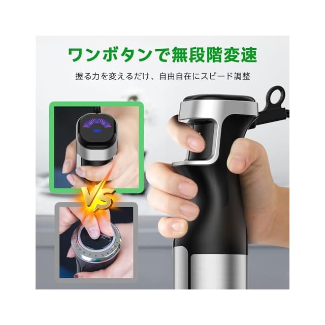 【無段階変速で食感も美味しさも思い通り】操作を簡単にするために、速度調整部分を無段階変速に改良した。事前にスピードを設定する必要がなく、お好みの仕上がりに合わせて、一つのボタンの握り具合を変えることでパワーを調整できます。BESROY ハンドブレンダーは1分間に約20000回の速さで回転するため、、より短時間に、どんな食材もあっという間に滑らかに、いつでもご家庭で楽しめます。忙しい育児の手間を減らせるのは大きな魅力です!(ブレンダーとカップの組み合わせだけで氷を砕けます。氷を砕くの場合には家庭用の氷で使用してください)