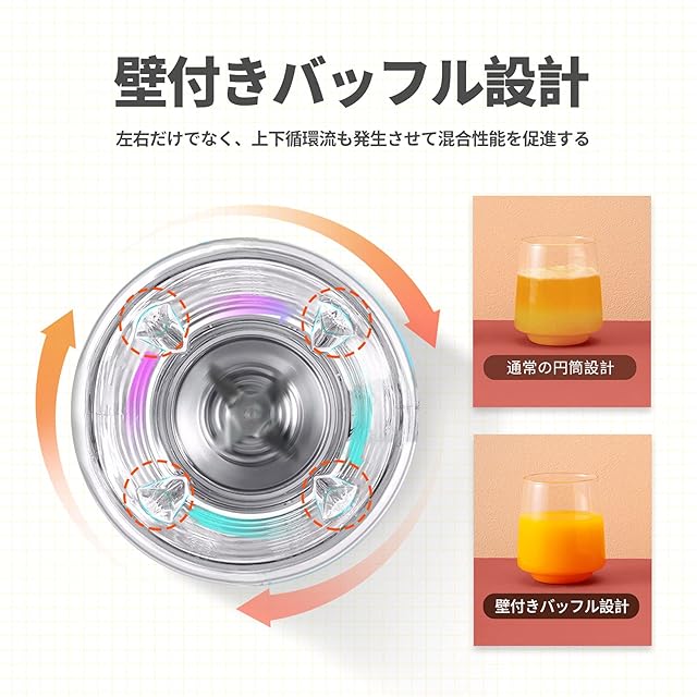 【独自カッター搭載】独自開発のステンレス鋼コートファイバーカッターを用いており、刃先はのこぎり状の大型6枚刃です。150W大出力モータを搭載しており、最大22000回/分の回転数で鋭い切れ味でパワフルに切削することができます。革命的な壁付きバッフル設計で均等な撹はんを実現し、繊維をより細かく切削できるのでなめらかに仕上がります。それだけでなく、氷も粉砕できるため、夏場に欠かせないかき氷も作れます。