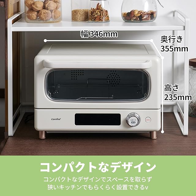【商品仕様】COMFEE' オーブントースター:◇コンパクトなサイズ:幅32×奥行27×高さ24cm ◇容量:10L トースト2枚焼き ◇電源:AC100V ◇最大出力:1,000W ◇温度調節:80~230℃無段階調節 ◇タイマー:最大30分 ◇機能:スチームオープン ◇付属品:角皿・焼き網・日本語取扱説明書