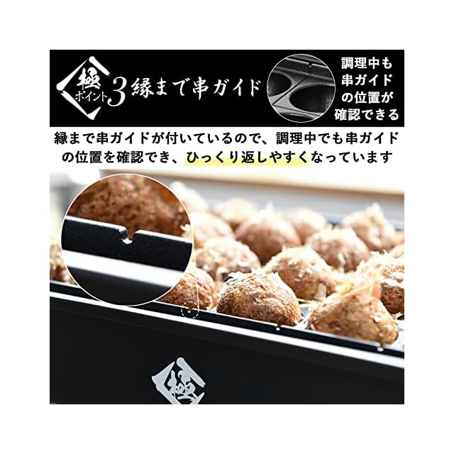 【縁まで串ガイド】各たこ焼き穴の間には串ガイドがついており、焼き穴からあふれたタネでたこ焼き同士がくっついても竹串などで簡単に切り離せ、形が揃ったキレイなたこ焼きが作れます。さらにフチまで串ガイドが付いているので、調理中でも串ガイドの位置を確認でき、ひっくり返しやすくなっています。