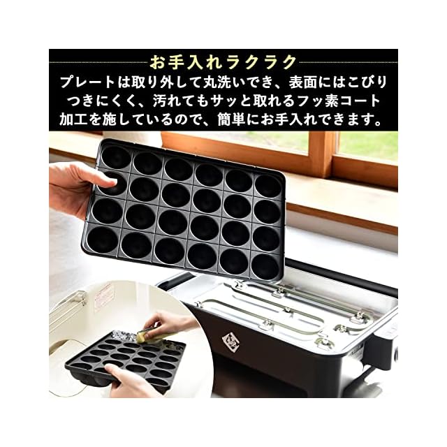 【簡単お手入れ】たこ焼きプレートは取り外して丸洗いでき、表面にはこびりつきにくいフッ素コート加工が施されているので、お手入れも簡単にできます。