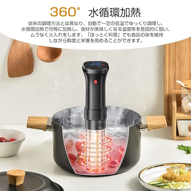 【低温調理技術&本来の味を保つ】先進的な低温調理技術により、調理プロセス中、食材が最適な味と栄養を維持します。1100Wの高効率加熱システム、安定した低温環境を維持しながら、急速加熱します。360°の水循環設計により、食材が均一に加熱され、局所的な過熱や加熱不足の現象を防ぎます。