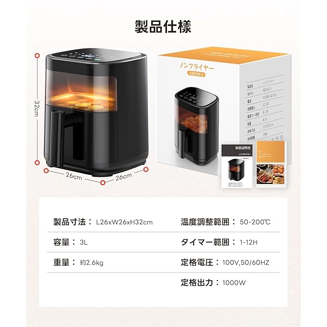 商品名:ノンフライヤー 3L エアーフライヤー air fryer ノンオイル 電気フライヤー 揚げ物・惣菜調理機 1~2人用 可視窓付き LEDタッチパネル 温度調整/タイマー 日本語説明書・レシピ付き PSE認証済