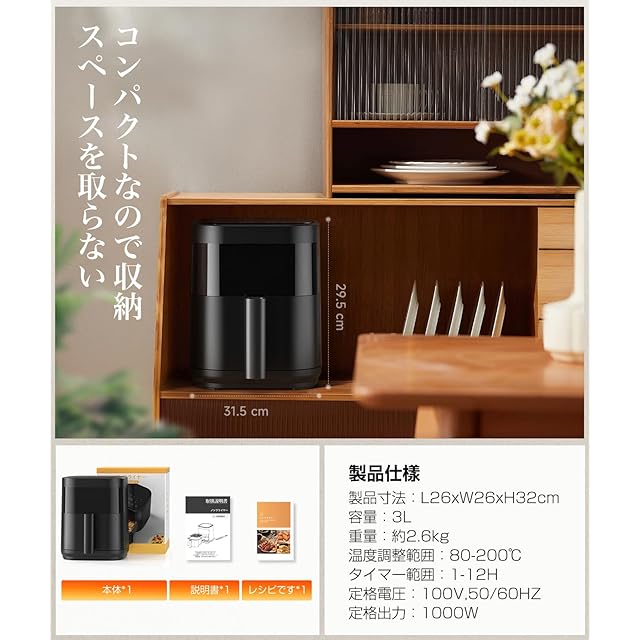 【ワンルームに最適な3Lコンパクト·小さなキッチンの救世主】 一人分の少量調理からカップルのディナーまで、食材を無駄にせず使い切れる理想的な容量で、食材を無駄にせず新鮮な料理が楽しめます。狭いキッチンやワンルームでもすっきり収納。忙しい朝は予約調理で目玉焼き、帰宅後は15分で完成する手作りからあげ。シングルライフを豊かにする時短家電です。