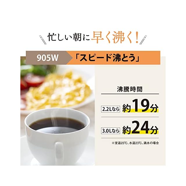 湯沸かし時間、消費電力量、蒸気を抑える 「沸とうセーブ」(選択式)90°C・80°C・70°C保温設定時に選択可能