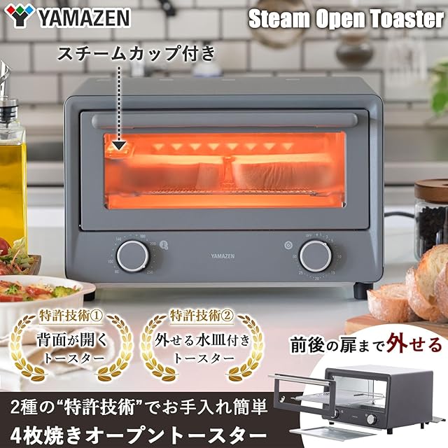 [山善] トースター オーブントースター トースト 4枚焼き スチーム機能 タイマー機能 1300W 「分解できてお手入れラクラク」 Open Toaster オープントースター メッシュ焼き網 受け皿付き ストーングレー YTU-CDC130(SG)