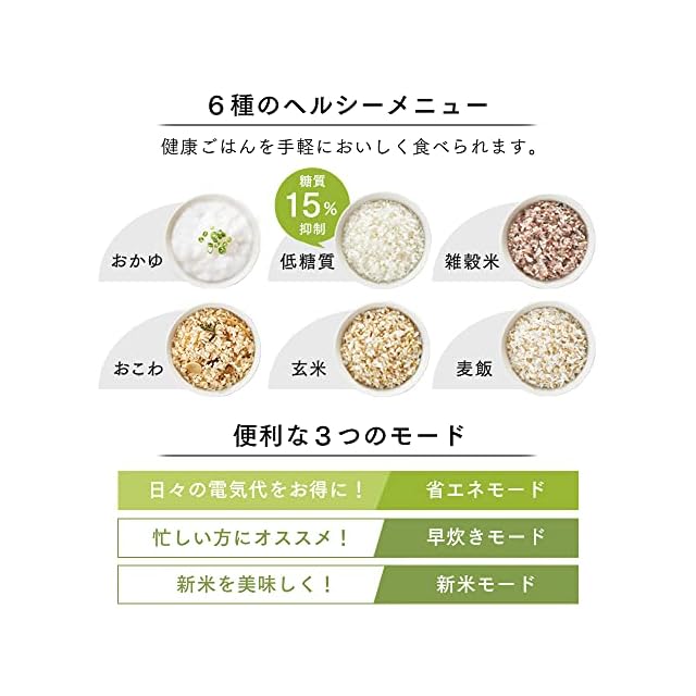 麦飯、玄米、雑穀米を炊くことが可能。炊込みごはん、おかゆもつくることができます。