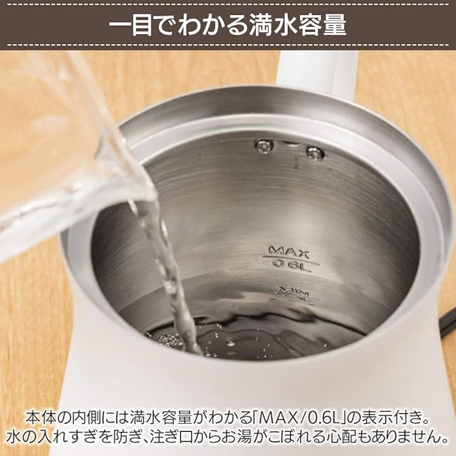 満水容量が見られるメモリ付きなので、お湯が吹きこぼれる心配がありません。さらに、内側がステンレス製のため、匂いが付きにくく、幅広い飲み物をお楽しみいただけます。