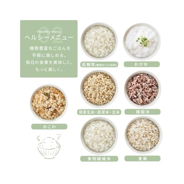 炊飯容量(最大):[無洗米、白米、新米、エコ、早炊き、冷凍、おむすび、すし飯、丼、カレー、胚芽米]0.54L(3合)[炊込み、食物繊維米、おこわ、雑穀米、発芽玄米、玄米、麦飯]0.36L(2合)[おかゆ(全がゆ/5ぶがゆ)]0.18L(1合)/0.09L(0.5合)[低糖質]0.27L(1.5合)