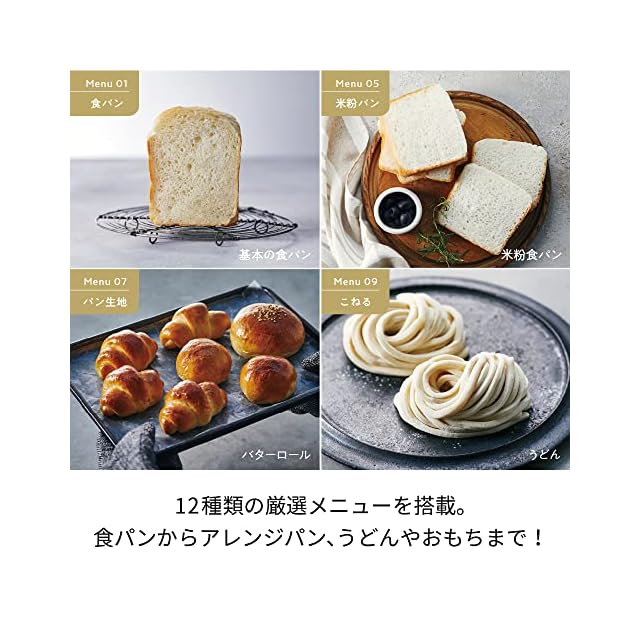 【厳選した12種類のメニューを搭載】毎日飽きずに食べられる食パン系の6メニュー(【食パン】・【アレンジ食パン】・【早焼き】・【全粒粉パン】・【米粉パン】・【フランスパン風】)に加え、うどんやパスタなどの麺類の生地、ピザ生地、もちなども作れます。